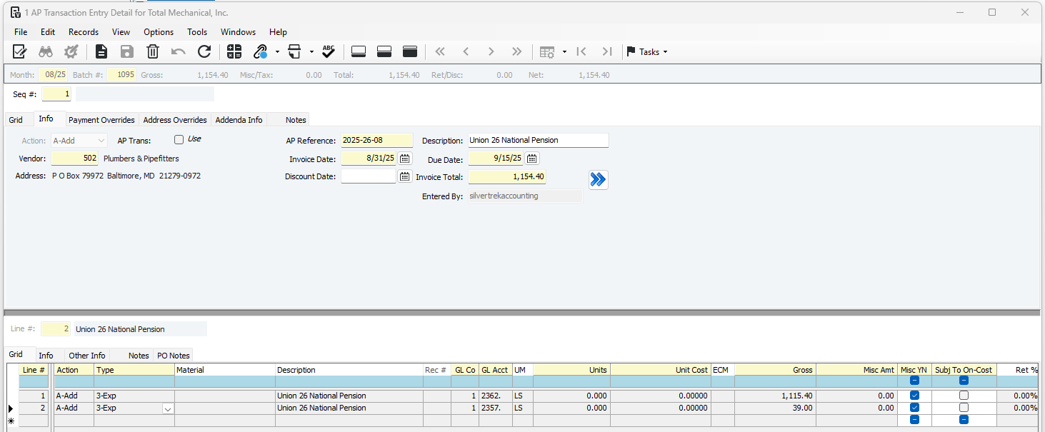 8. Enter in AP (Month is the same as reporting month) (not payment) in Vista (Vendor 1136) - AP Ref Format: YYYY-26-MM GL 2360 . Attach the invoice and payment confirmaiton.